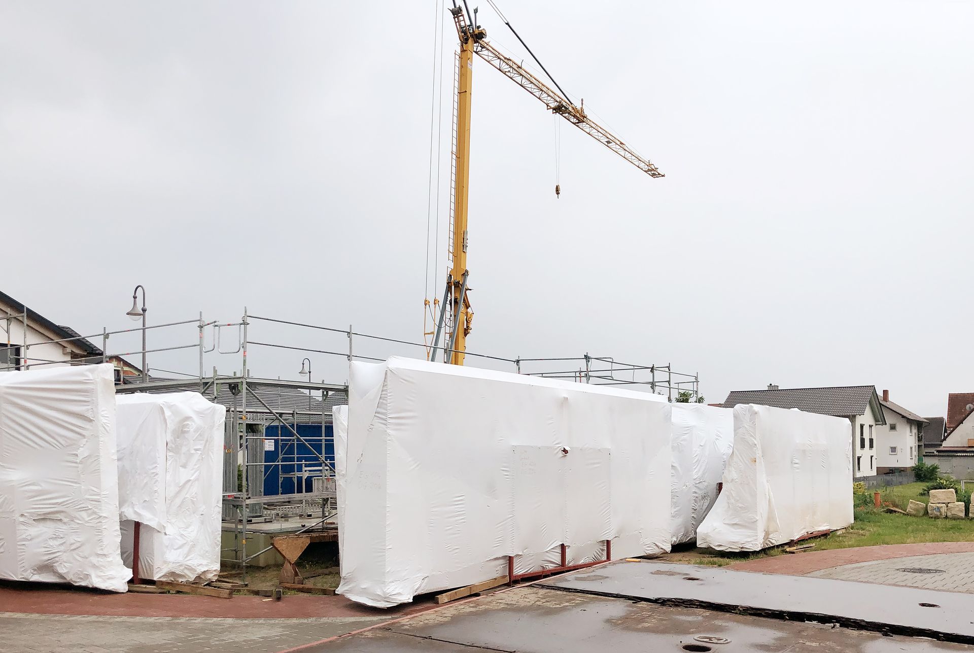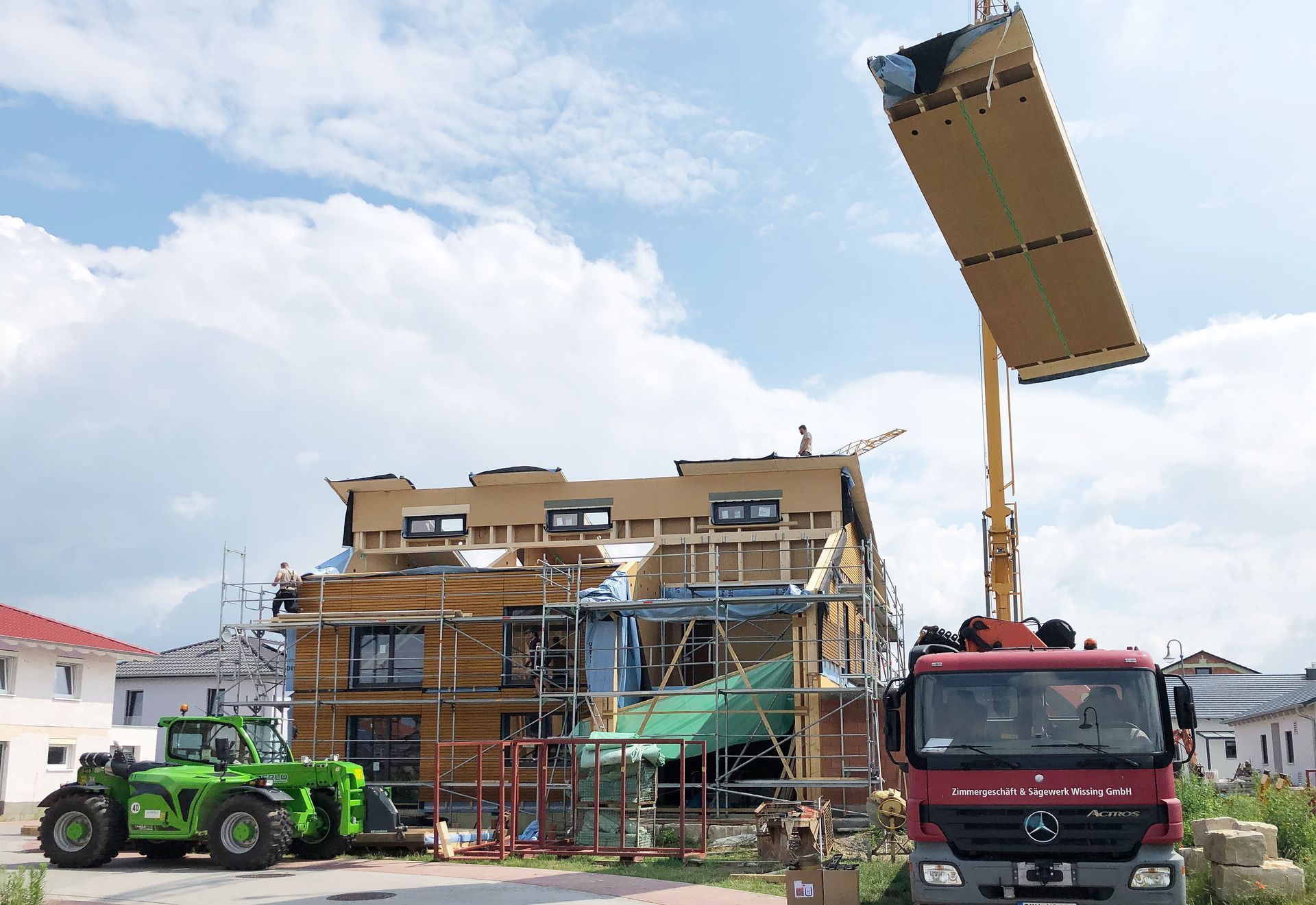 Unser Leistungsumfang umfasste die Planung, die komplette Baustelleneinrichtung, die Vorfertigung der Wand-, Decken- und Dachelemente, die Montage, den Fensterbau, die Fassadengestaltung sowie sämtliche Dachdeckerarbeiten.