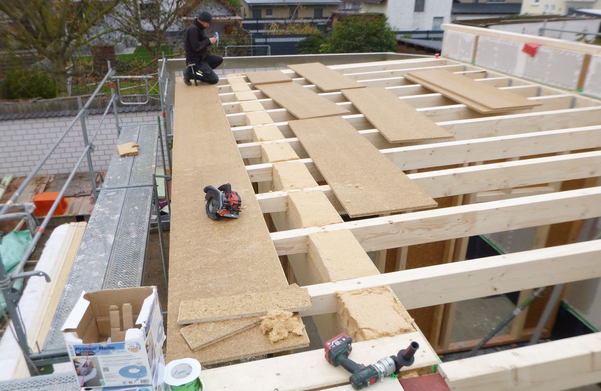 Die Decke über dem Erdgeschoss wurde als Holzbalkendecke in Nichtsicht-Konstruktion ausgeführt und im Bereich des Anbaus als Flachdach-Aufbau gedämmt.