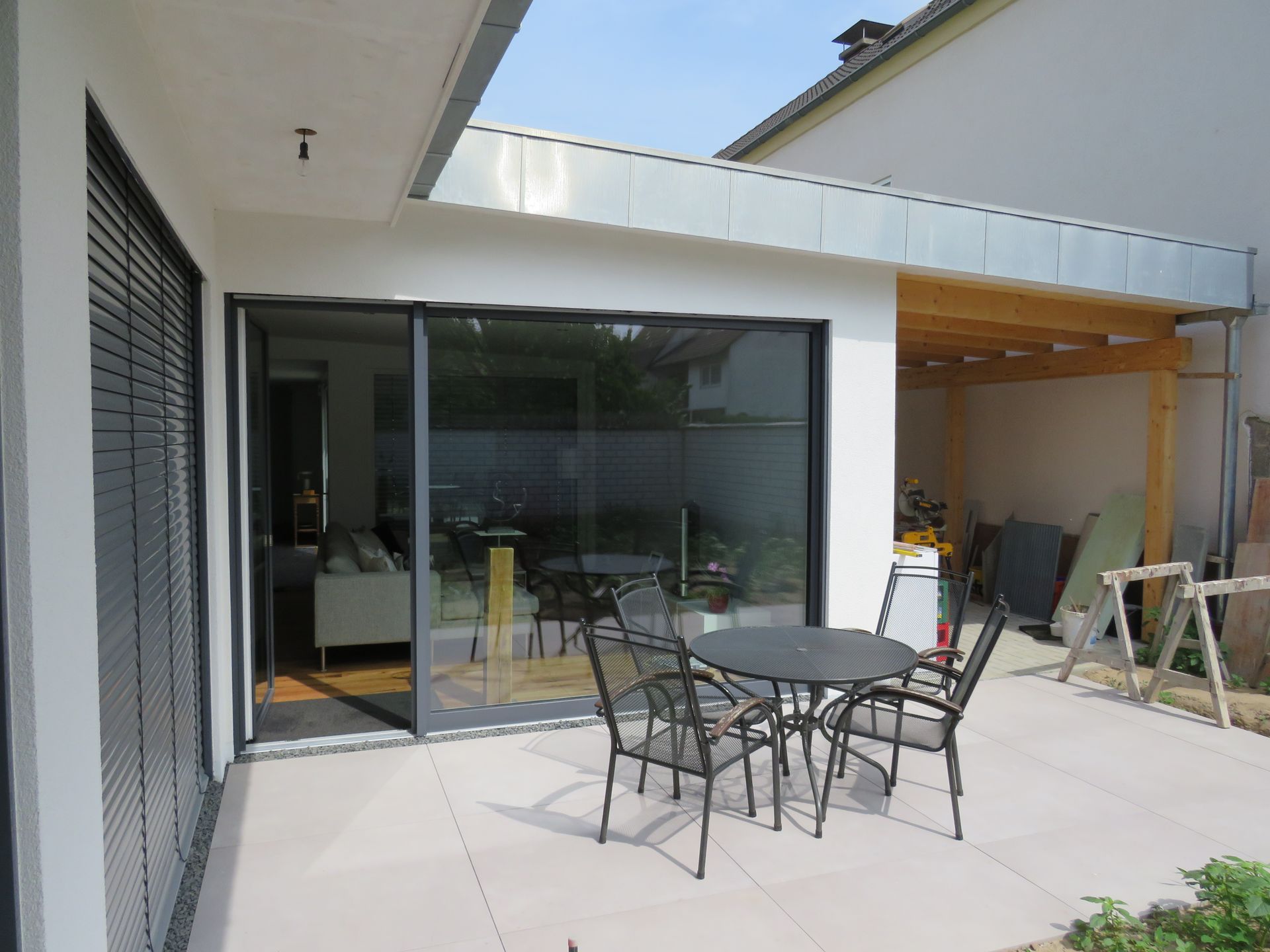 Stegträger-Aufdachdämmung, wodurch ein effizienter Wärmeschutz bei zugleich schlanker Bauweise realisiert werden konnte. Eine moderne schlichte Optik in waagrechter Verlegung als Eyecatcher.